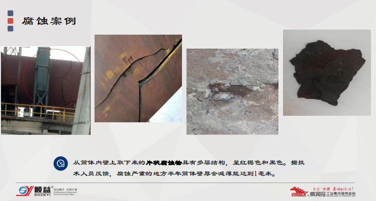 水泥回轉(zhuǎn)窯一般在1300℃以上的溫度中運(yùn)行,在內(nèi)襯耐火磚進(jìn)行耐磨、隔熱防護(hù)后窯筒外壁長(zhǎng)期處在300-400℃高溫,窯體除了耐火磚因窯體轉(zhuǎn)動(dòng)而產(chǎn)生的摩擦外,還會(huì)受到高溫氧化、高溫腐蝕、冷凝腐蝕及酸堿腐蝕情況,尤其是近些年對(duì)環(huán)保的重視,要求部分水泥廠協(xié)同處理焚燒生活垃圾產(chǎn)生含氟離子介質(zhì);又因燃煤的品質(zhì)情況,導(dǎo)致在焚燒的過程中,產(chǎn)生大量的含有氮氧化物、硫化物等氣象腐蝕介質(zhì),以上腐蝕介質(zhì)都加快了回轉(zhuǎn)窯筒體的腐蝕,也會(huì)對(duì)回轉(zhuǎn)窯的安全生產(chǎn)造成影響。